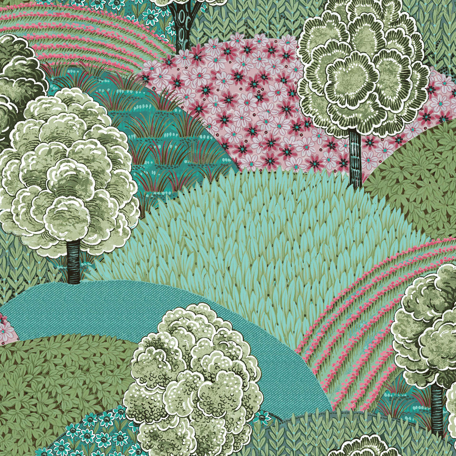 Matte, grüne Vliestapete mit einem Motiv aus Bäumen und Hügeln mit Blumen und Blättern in Grün, Türkis und Rosa.