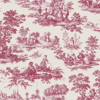 Matte, beige Vliestapete mit einem Motiv aus burgunderfarbenen Figuren im viktorianischen Stil in Natur und Park. Das Foto des Innenraums dient nur zur Veranschaulichung – verschiedene Farben.