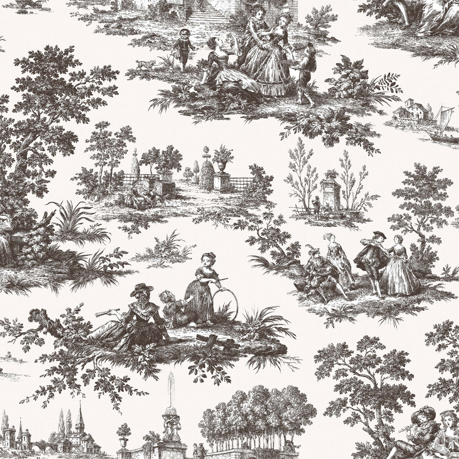 Matte, weiße Vliestapete mit einem Motiv aus dunkelbraunen Figuren im viktorianischen Stil in Natur und Park. Das Foto des Innenraums dient nur zur Veranschaulichung – verschiedene Farben.