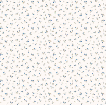 Matte, weiße Vliestapete mit kleinen Blüten mit Blättern in Rosa und Grün.