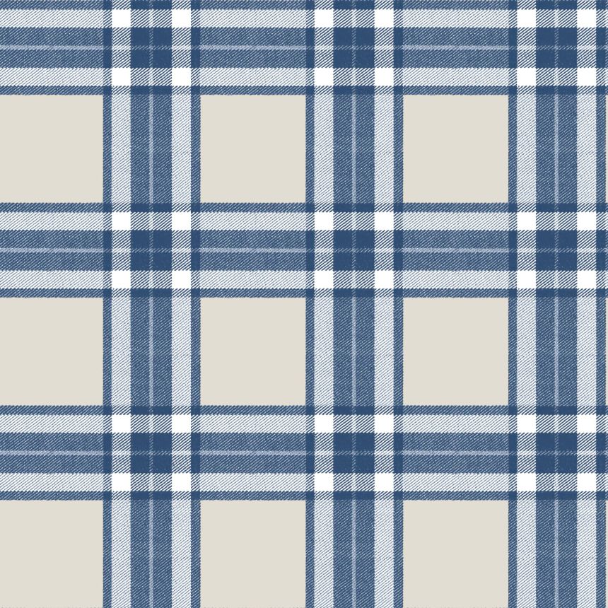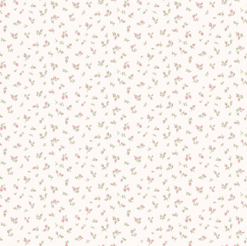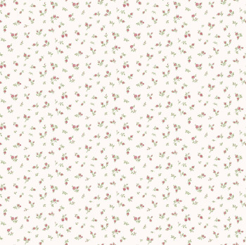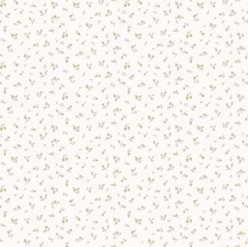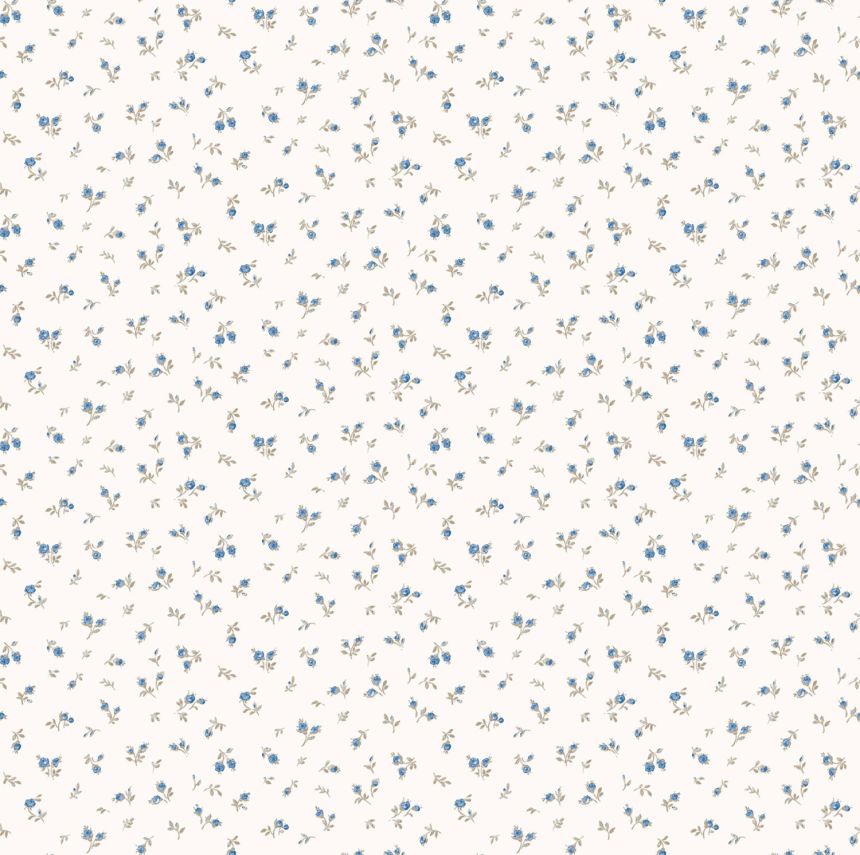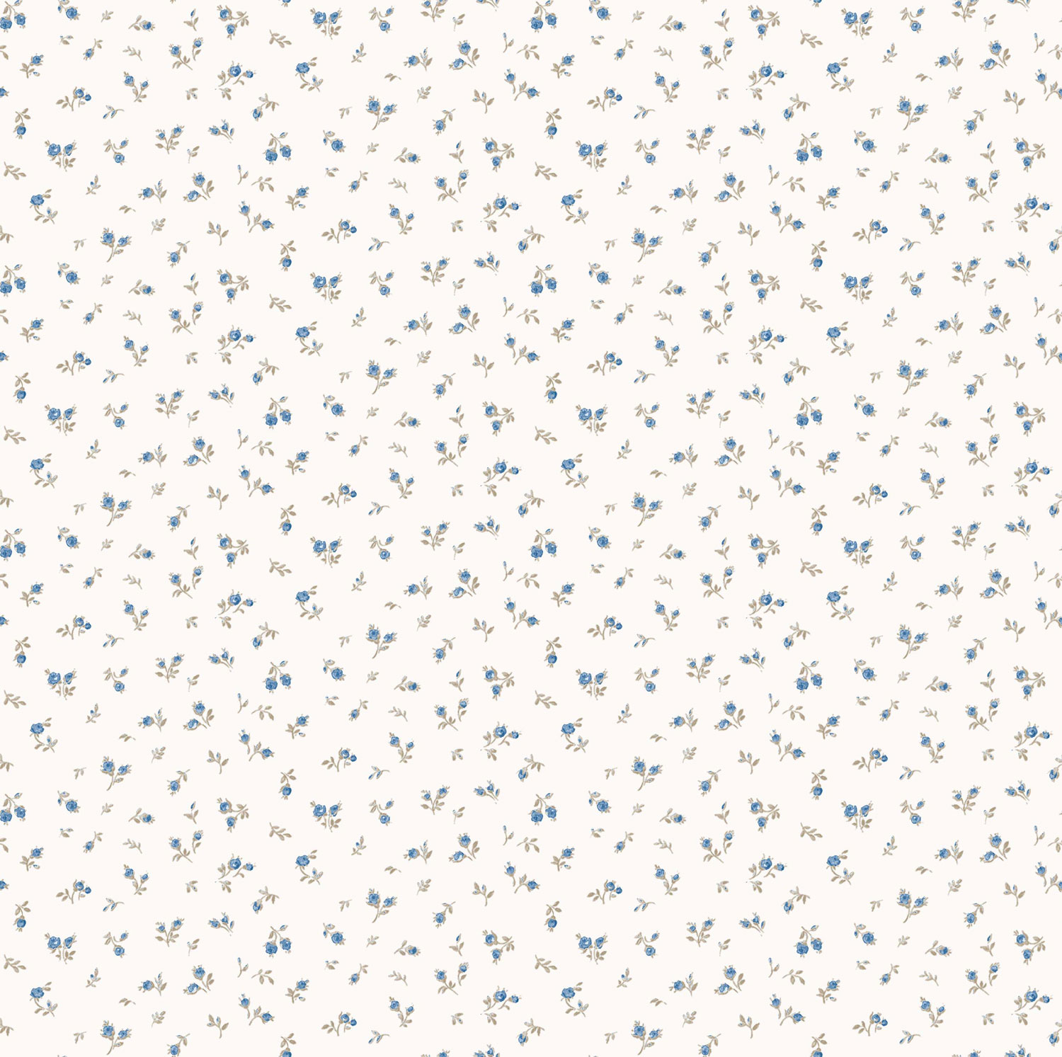 Matte, weiße Vliestapete mit kleinen Blüten mit Blättern in Blau und Beige.