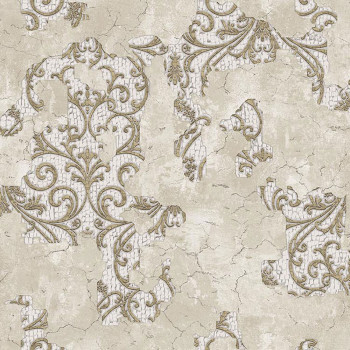 Luxuriöse geprägte beigeFarbenene Vliestapete mit Vinyloberfläche, goldenes barockes Ornamentmuster unter Stuckputz.