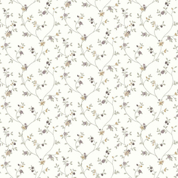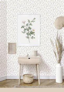 Matte, weiße Vliestapete mit floralem Muster aus graugrünen Zweigen mit Blüten und Früchten, der Hintergrund imitiert einen feinen Putz.