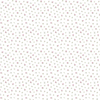 Matte, weiße Vliestapete mit einem kleinen Blumenmuster aus rosa und grauen Rosen auf einem Hintergrund, der feinen Putz imitiert.