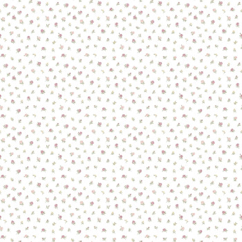Matte, weiße Vliestapete mit einem kleinen Blumenmuster aus rosa und bordeauxroten Rosen auf einem Hintergrund, der feinen Putz imitiert.