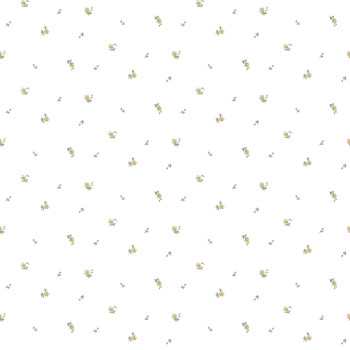 Matte, weiße Vliestapete mit kleinen gelben Rosen auf weißem Hintergrund, die feinen Putz imitiert.