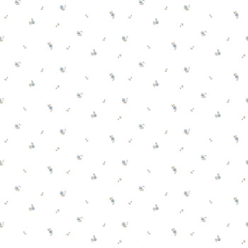 Matte, weiße Vliestapete mit kleinen blauen Rosen auf weißem Hintergrund, die feinen Putz imitiert.