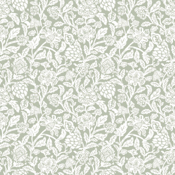 Matte, grüne Vliestapete mit weißem Blumenmuster mit Blättern auf einem Hintergrund, der feinen Putz imitiert.