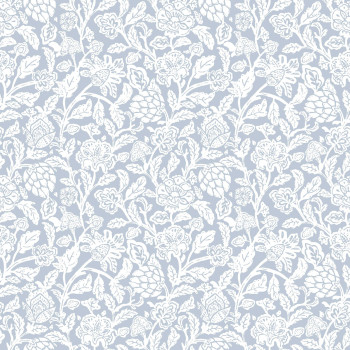 Matte, hellblaue Vliestapete mit weißem Blumenmuster mit Blättern auf einem Hintergrund, der feinen Putz imitiert.