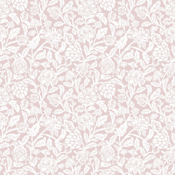 Matte, rosa Tapete mit weißem Blumenmuster mit Blättern auf einem Hintergrund, der feinen Putz imitiert.