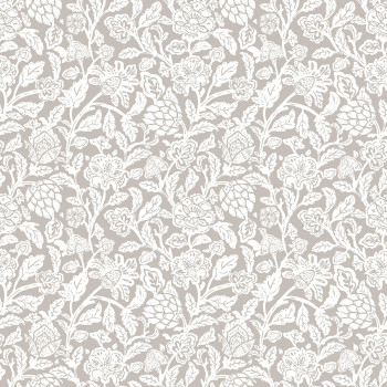 Matte, graue Vliestapete mit weißem Blumenmuster mit Blättern auf einem Hintergrund, der feinen Putz imitiert.