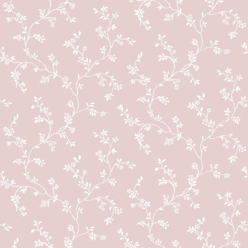Matte, rosa Vliestapete mit einem Muster aus weißen blühenden Zweigen auf dem Hintergrund, die einen feinen Putz imitieren.