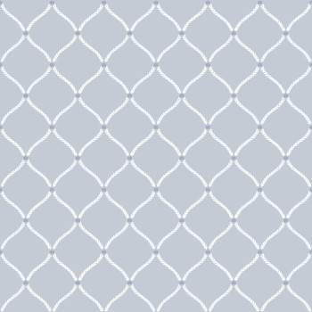 Matte, hellblaue Vliestapete mit geometrischem Ornamentmuster in Weiß, der Hintergrund imitiert einen feinen Putz.