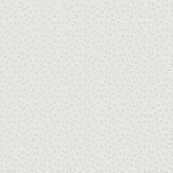 Matte, weiße Vliestapete mit kleinen Zweigen in Ockerfarbe auf einem Hintergrund, der feinen Putz imitiert.