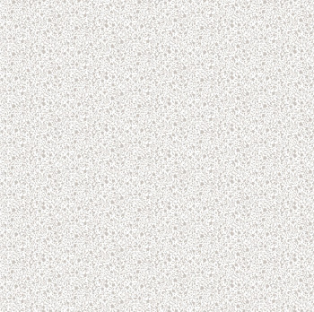 Matte, weiße Vliestapete mit kleinen floralen Ornamenten in Grau auf einem Hintergrund, der feinen Putz imitiert.