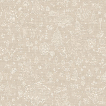 Sanft geprägte beige Kindervliestapete, weiße Umrisse von Tieren und Pflanzen. Das Innenfoto dient nur zur Veranschaulichung - verschiedene Farben.