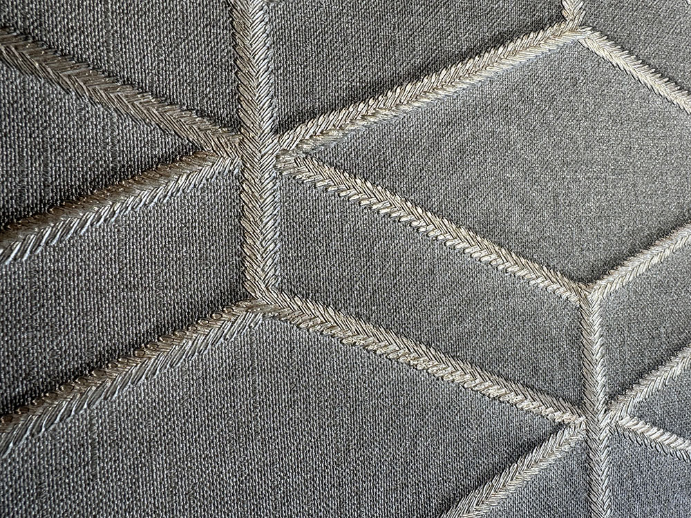 Luxuriöse Vliestapete mit Vinyloberfläche – Design aus seidig grauem Stoff mit dezentem Halbglanz, Musterkonturen – metallisch-goldene „Nähte“.