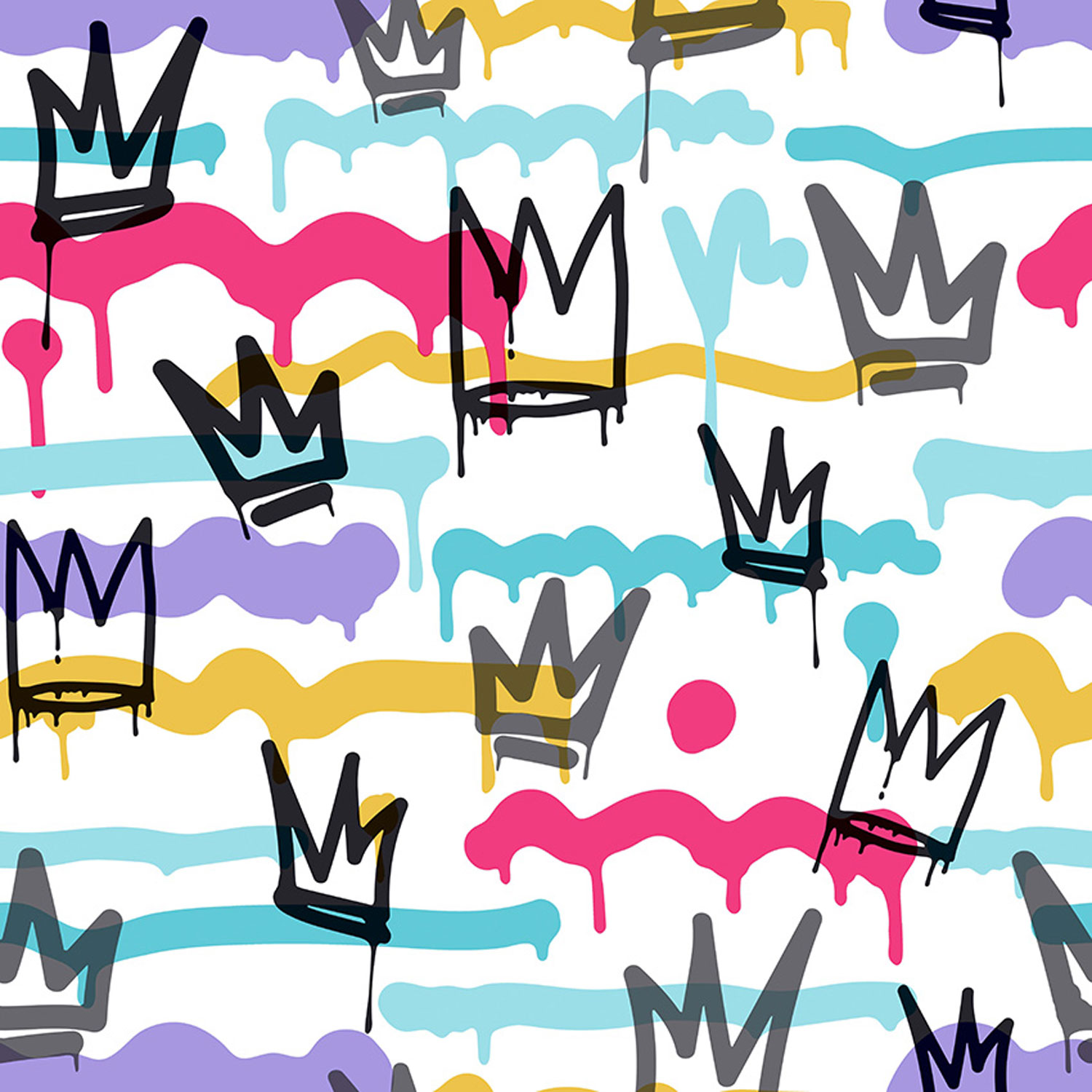 Glatte weiße Vliestapete, Street Art - Türkis-, Lila-, Rosa- und Goldtöne.