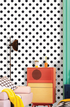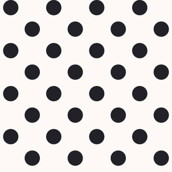 Glatte weiße Vliestapete, schwarze Punkte. Punkte ca. 4,5 cm. Das Innenfoto dient nur zur Illustration.