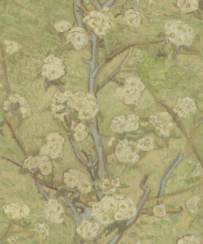 Vliestapete mit floralem Muster in Grün- und Brauntönen - ausgeprägte Pinselstriche, geprägter Effekt. Das Innenfoto dient nur zur Illustration. Inspiriert von der Arbeit von Vincent Van Gogh – Blühender Birnbaum.
