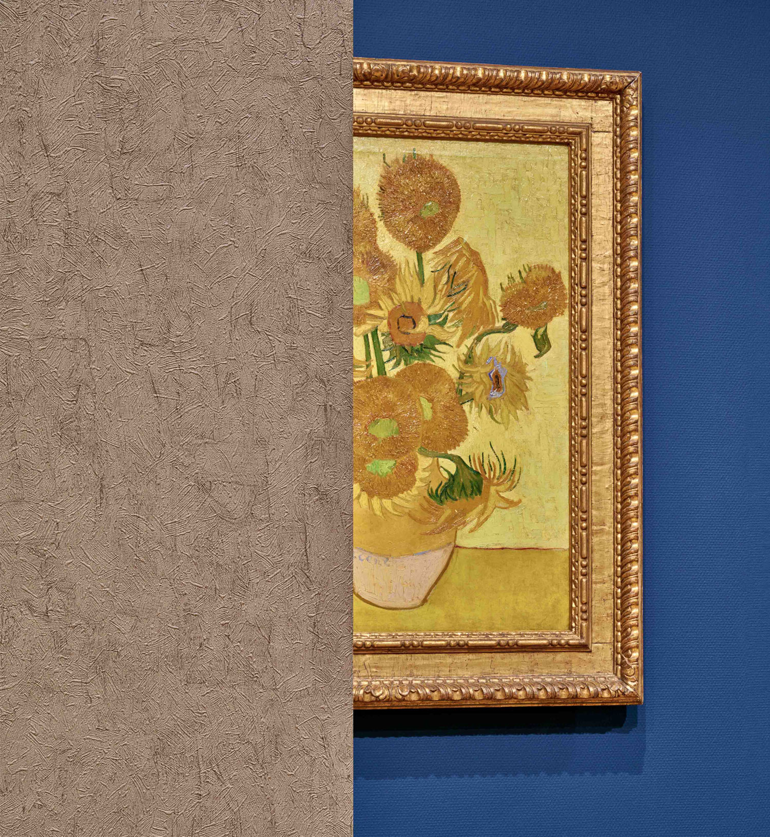 Ergänzt wird der Katalog durch eine Tapete mit einem Kreis, in dem ein Blumenstrauß platziert ist, der in den Gemälden des Meisters Van Gogh verwendet wurde. Tapeten mit markanten Pinselstrichen und verschiedenen Blumen auf farblich kontrastierenden Hintergründen bringen die Malerei in Ihr Zuhause.