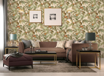 Vliestapete mit Vinyloberfläche – hellbeiger Hintergrund mit dezent Halbglanz, Metallic-Strukturen in Grün- und Orangetönen. Farben und Reflexionen ändern sich je nach Lichteinfall auf die Tapete.