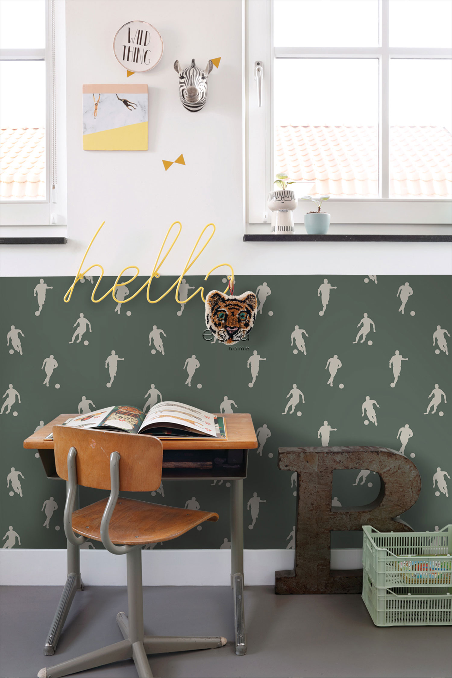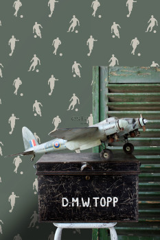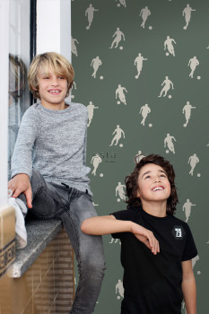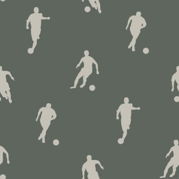 Dunkelgrüne Vliestapete, Fußballspieler-Motive.