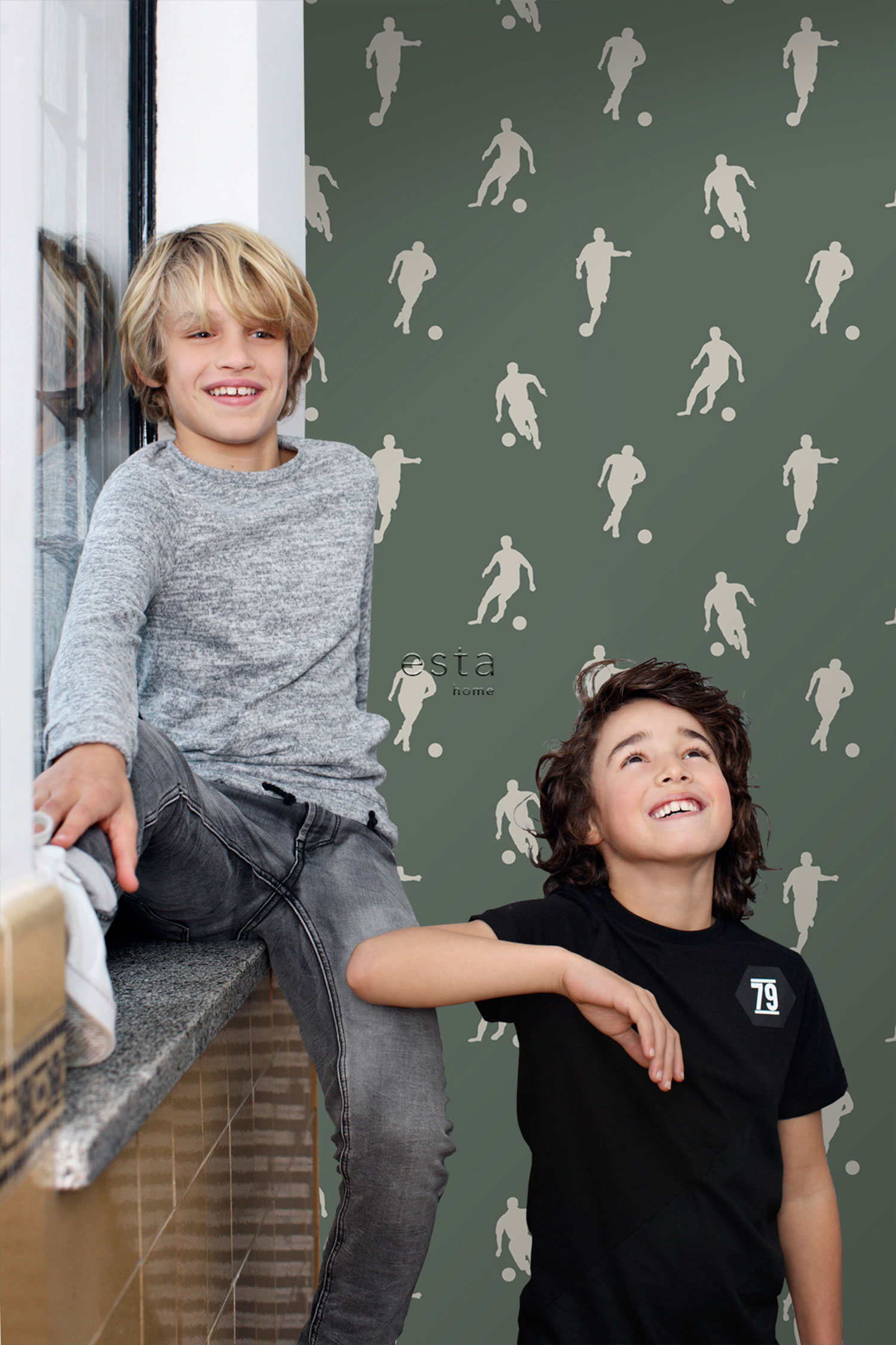 Dunkelgrüne Vliestapete mit Fußballspielern, 139507, To the Moon and Back, Esta Home