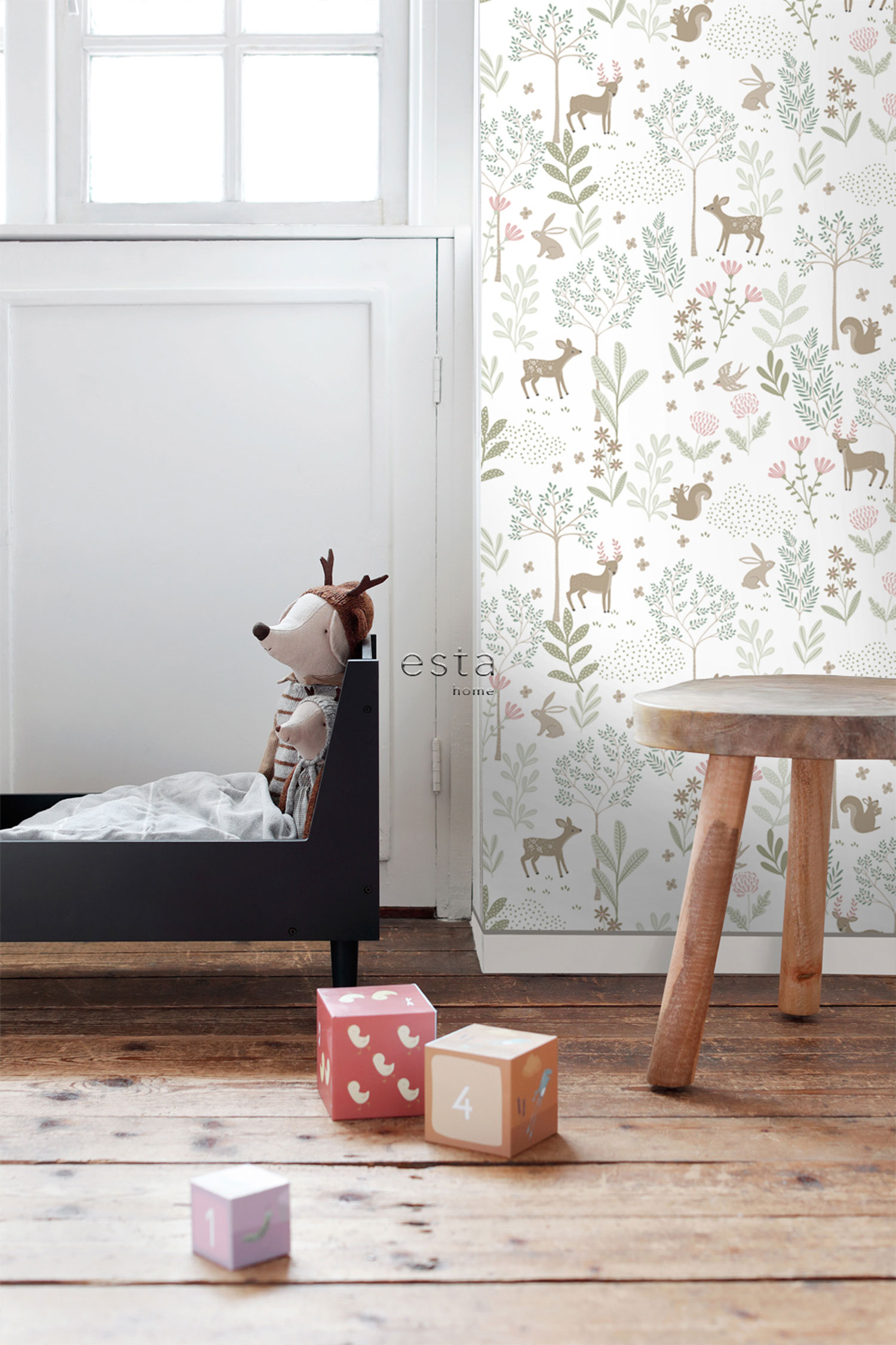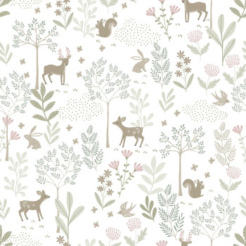 Glatte weiße Vliestapete, Kindermuster aus Natur und Tieren in Braun-, Grün- und Rosatönen.