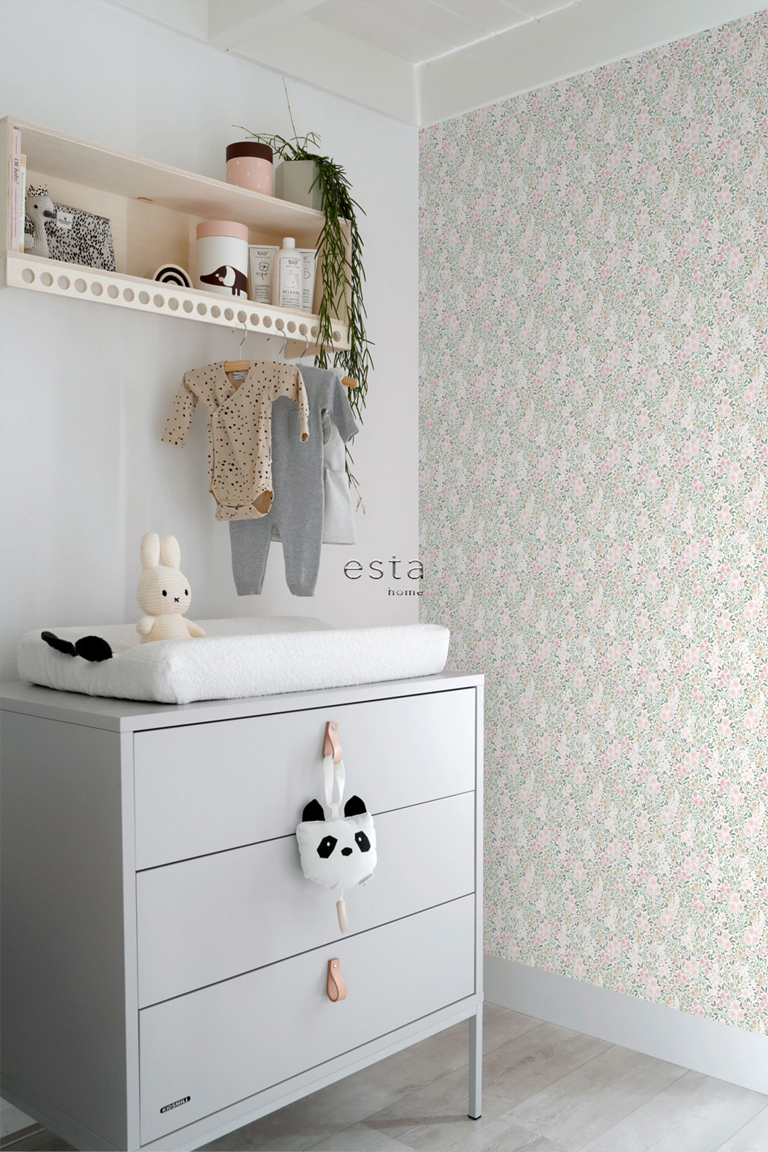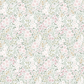 Glatte Vliestapete, florales Muster in pastelligen Grün-, Türkis-, Rosa- und Beigetönen.