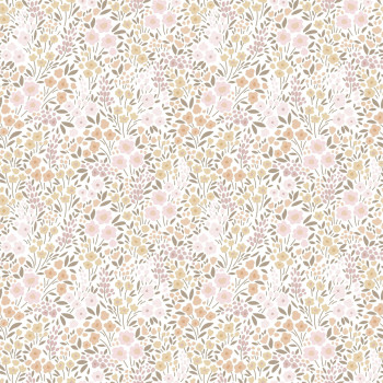 Glatte Vliestapete, florales Muster in Grün-, Orange- und Rosatönen.