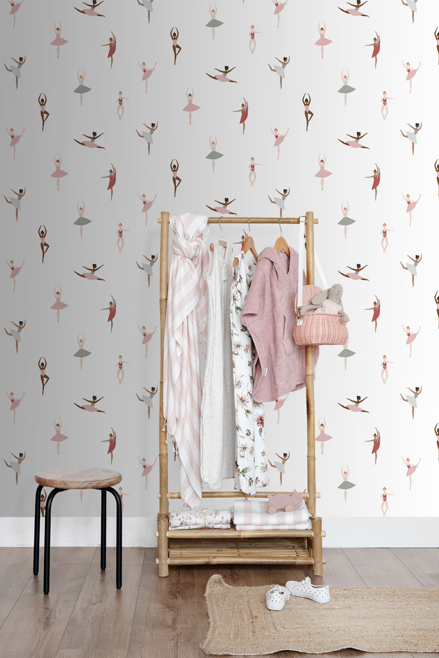 Glatte Vliestapete, Ballerinas in Braun-, Grau- und Rosatönen.