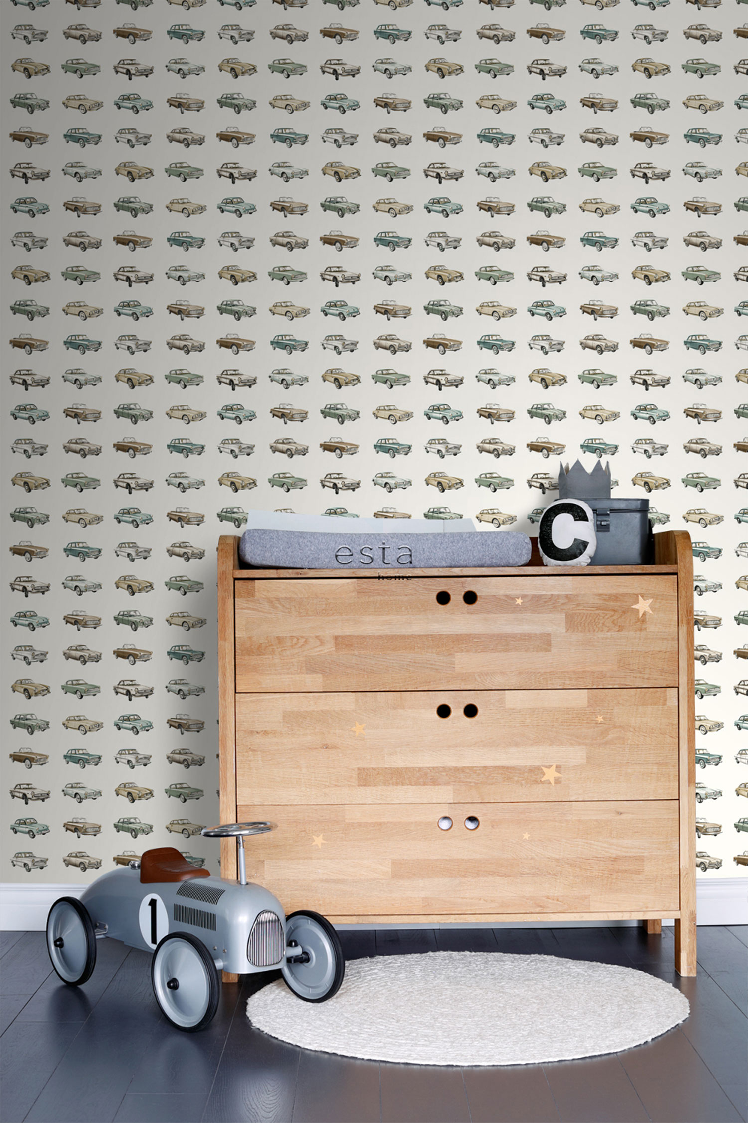 Glatte weiße Vliestapete, Autos in Blau-, Grün-, Braun- und Beigetönen.
