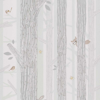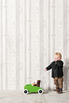 Vlies, Kindertapete. Graue und weiße Farbtöne, halbglänzendes Grün, Tiere in grauen, braunen und gelben Farben.