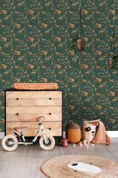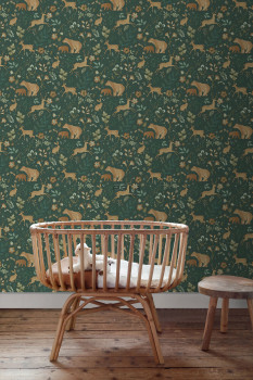 Dunkelgrüne glatte Vliestapete, Kindermuster aus Natur und Tieren in Braun- und Grüntönen.