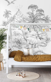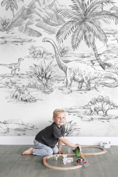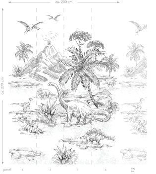 Schwarz-weiße Vliestapete Wandbilder mit Dinosauriern. Die Tapete hat ein durchgehendes Muster, für eine größere Breite müssen Sie einfach ein weiteres Stück kaufen. 4 Teile 50x279cm