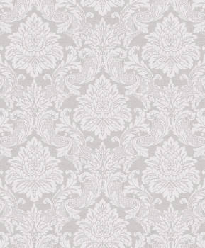 Fein strukturierte graue Vliestapete - mattes barockes Damastmuster, halbglänzender Hintergrund, Imitation eines gröberen Stoffes.
