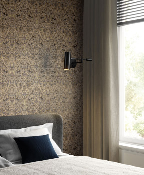 Fein strukturierte schwarze Vliestapete – barockes Damastmuster mit halbglänzenden bronzefarbenen Konturen.