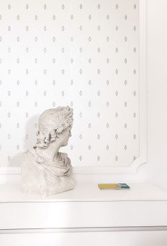 Glatte beigefarbene Vliestapete mit dezent geprägtem Muster in Silber und Schwarz.