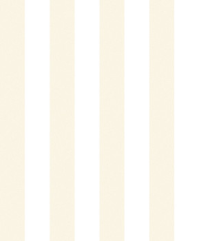 Glatte Vliestapete, Streifen in Metallic-Goldbeige und Mattweiß. Streifen 6,5 cm