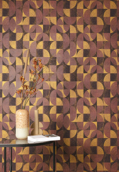 Luxuriöse, zart geprägte, geometrische Vliestapete in Burgunder- und Goldtönen.