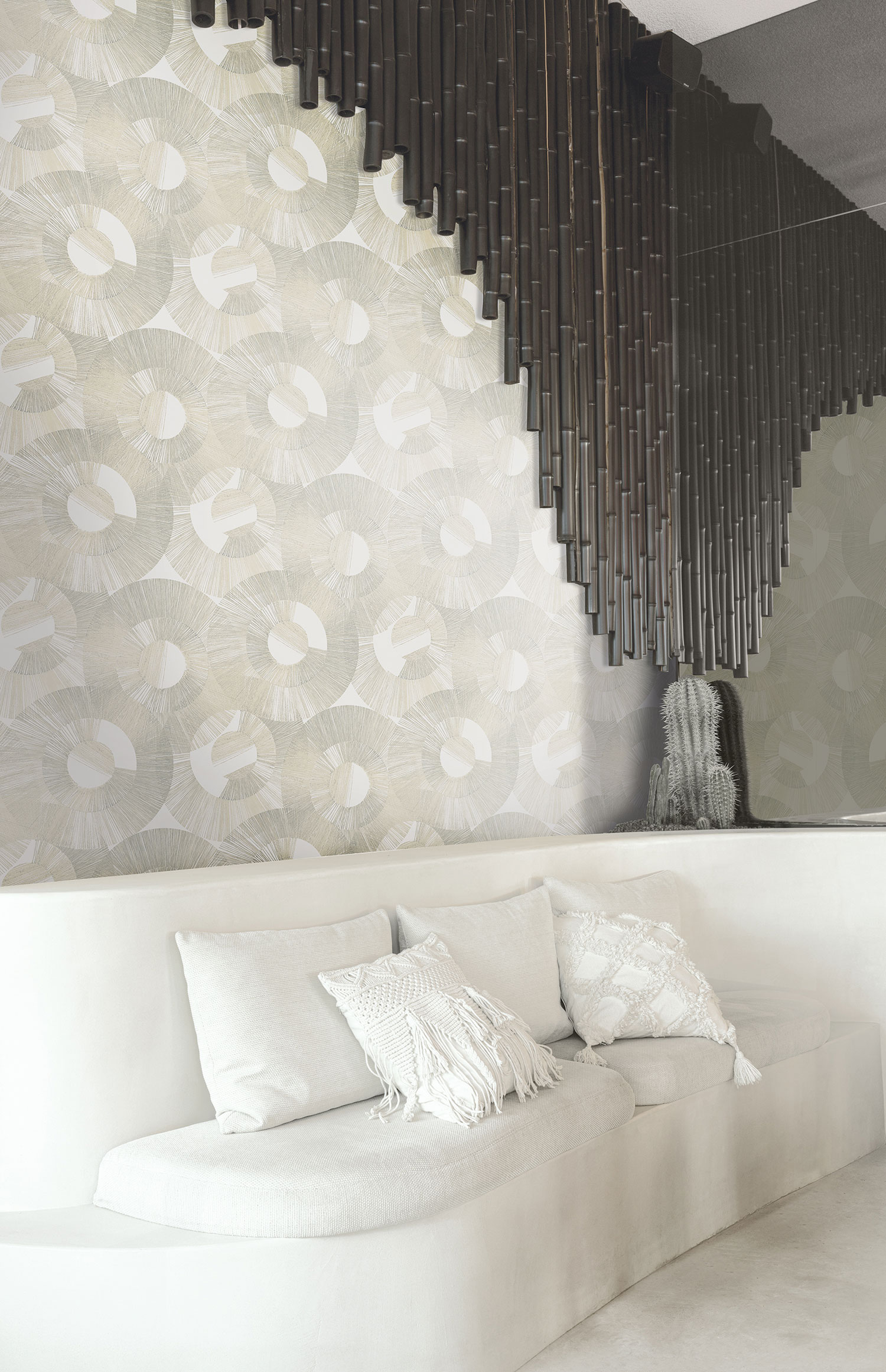 Luxuriöse Vliestapete, geometrisches Kreismuster, Grau- und Cremetöne, metallische Details.