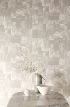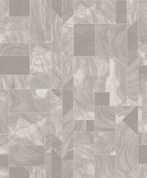 Marmorierte Vliestapete, geometrisches Muster in Grautönen, metallische Silberkonturen.
