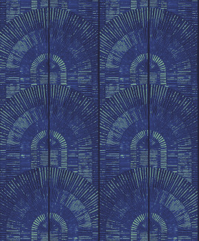 Luxuriöse Vliestapete mit spektakulärem Art-Déco-Muster - blau und metallisch grün.