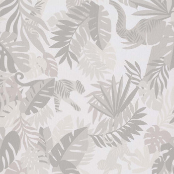 Abwaschbare Vliestapete mit feiner Gewebestruktur. Tropische Blätter, Elefanten, Tiger, Giraffen, Affen ... in Grau- und Beigetönen auf cremefarbenem Hintergrund.