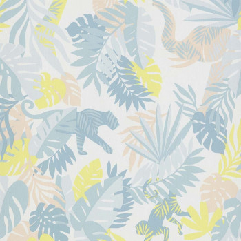 Abwaschbare Vliestapete mit feiner Gewebestruktur. Tropische Blätter, Elefanten, Tiger, Giraffen, Affen ... in Blau-, Türkis-, Lachs- und Gelbtönen.