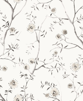 Glatte weiße Vliestapete, blühende Zweige in grau-silbernen Farbtönen.