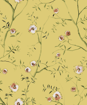 Glatte ockerfarbene Vliestapete, blühende Zweige in Grün- und Weißtönen mit bronzefarbenen Details.