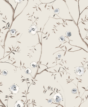 Glatte beige Vliestapete, blühende Zweige in Braun-, Creme- und Silbertönen.