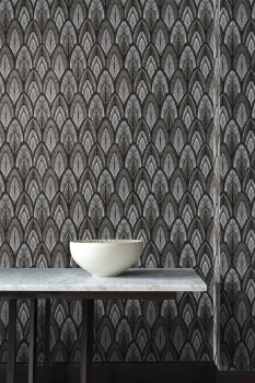 Zart geprägte schwarz-silberne Vliestapete, Motiv Blätter.